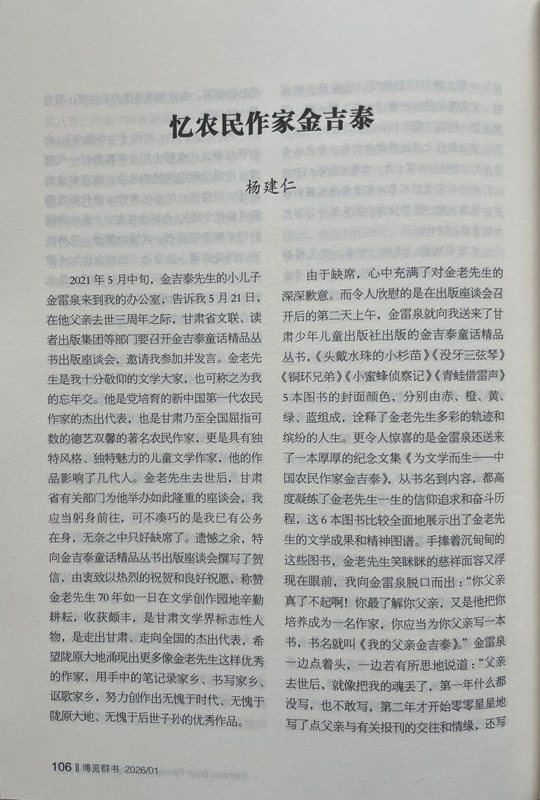 由于缺席,心中充滿了對金老先生的深深歉意。而令人欣慰的是在出版座談會召開后的第二天上午,金雷泉就向我送來了甘肅少年兒童出版社出版的金吉泰童話精品叢書,《頭戴水珠的小杉苗》《沒牙三弦琴》《銅環(huán)兄弟》《小蜜蜂偵察記》《青蛙借雷聲》5本圖書的封面顏色,分別由赤、橙、黃、綠、藍組成,詮釋了金老先生多彩的軌跡和繽紛的人生。更令人驚喜的是金雷泉還送來了一本厚厚的紀念文集《為文學而生——中國農民作家金吉泰》,從書名到內容,都高度凝練了金老先生一生的信仰追求和奮斗歷程,這6本圖書比較全面地展示出了金老先生的文學成果和精神圖譜。手捧著沉甸甸的這些圖書,金老先生笑瞇瞇的慈祥面容又浮現在眼前,我向金雷泉脫口而出:“你父親真了不起??!你最了解你父親,又是他把你培養(yǎng)成為一名作家,你應當為你父親寫一本書,書名就叫《我的父親金吉泰》。”金雷泉一邊點著頭,一邊若有所思地說道:“父親去世后,就像把我的魂丟了,第一年什么都沒寫,也不敢寫,第二年才開始零零星星地寫了點父親與有關報刊的交往和情緣,還寫了點父親在生活和寫作中的軼事趣聞。您的建議非常好,我擔心駕馭不好,試試看吧。”我感覺金雷泉有點為難,馬上又安慰他:“不急,你用兩三年時間慢慢寫。”