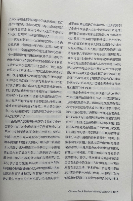由敦煌文藝出版社出版的《我的父親金吉泰》,有108個趣味橫生的故事組成,多角度、多側面講述了金老先生學習、創(chuàng)作、生活、生產、為人處世等方面的生動細節(jié),用小視角折射出了大情懷,用小切口彰顯出了大境界,成功塑造了一手耕田、一手握筆的農民作家的典型形象,生動刻畫了一生沉醉文學、癡心不改的堅守者的心靈世界,忠實記錄了金老先生70年如一日在文學創(chuàng)作園地精心耕耘的快樂時光和輝煌歷程。這本回憶錄故事講述精彩,盡管每個故事文字不長,看似生活中的平常小事,但仔細閱讀才發(fā)現都是精心篩選的經典故事,讓人們看到了金老先生漫長人生途中最出彩、最可貴、最有趣的幸福時刻和生活場景。細節(jié)描述生動,故事中許多細節(jié)新鮮活潑、栩栩如生,將人們情不自禁地帶入到現實場面中,讀起來耐人尋味、引人入勝。情感真摯飽滿,敘述的故事幾乎都用白描的手法,親切自然,真實可信,讓讀者在深情厚誼中深刻感悟到金老先生高貴的靈魂和高尚的品格??梢哉f,這本書是金老先生精彩人生的高度縮影,是人品和文品相映生輝的集中展示,也是父子作家堅守文學理想的深情告白,讀來韻味悠長,感同身受,仿佛金老先生又笑瞇瞇地來到了我們身旁。