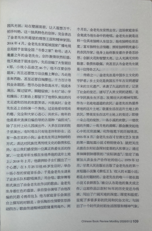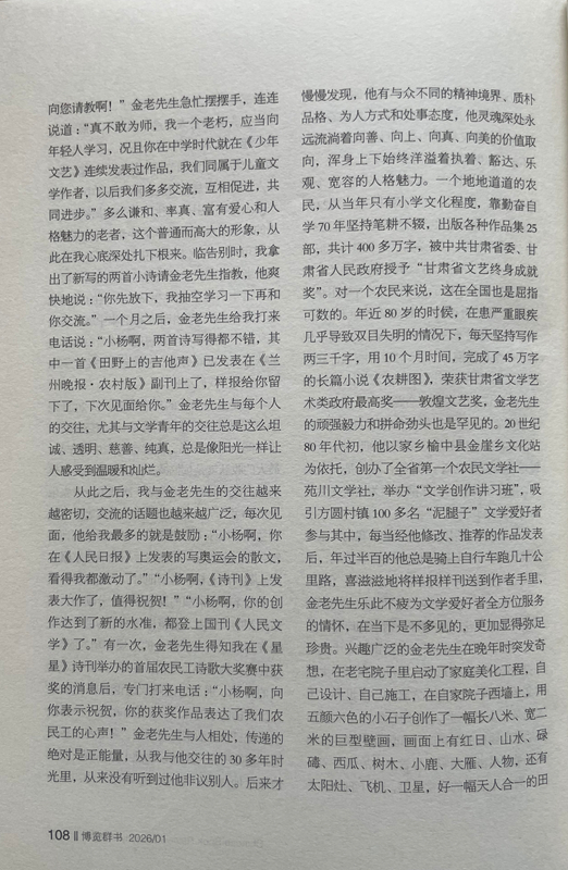 從此之后,我與金老先生的交往越來越密切,交流的話題也越來越廣泛,每次見面,他給我最多的就是鼓勵:“小楊啊,你在《人民日報》上發(fā)表的寫奧運會的散文,看得我都激動了。”“小楊啊,《詩刊》上發(fā)表大作了,值得祝賀!”“小楊啊,你的創(chuàng)作達到了新的水準,都登上國刊《人民文學》了。”有一次,金老先生得知我在《星星》詩刊舉辦的首屆農民工詩歌大獎賽中獲獎的消息后,專門打來電話:“小楊啊,向你表示祝賀,你的獲獎作品表達了我們農民工的心聲!”金老先生與人相處,傳遞的絕對是正能量,從我與他交往的30多年時光里,從來沒有聽到過他非議別人。后來才慢慢發(fā)現,他有與眾不同的精神境界、質樸品格、為人方式和處事態(tài)度,他靈魂深處永遠流淌著向善、向上、向真、向美的價值取向,渾身上下始終洋溢著執(zhí)著、豁達、樂觀、寬容的人格魅力。一個地地道道的農民,從當年只有小學文化程度,靠勤奮自學70年堅持筆耕不輟,出版各種作品集25部,共計400多萬字,被中共甘肅省委、甘肅省人民政府授予“甘肅省文藝終身成就獎”。對一個農民來說,這在全國也是屈指可數的。年近80歲的時候,在患嚴重眼疾幾乎導致雙目失明的情況下,每天堅持寫作兩三千字,用10個月時間,完成了45萬字的長篇小說《農耕圖》,榮獲甘肅省文學藝術類政府最高獎——敦煌文藝獎,金老先生的頑強毅力和拼命勁頭也是罕見的。20世紀80年代初,他以家鄉(xiāng)榆中縣金崖鄉(xiāng)文化站為依托,創(chuàng)辦了全省第一個農民文學社——苑川文學社,舉辦“文學創(chuàng)作講習班”,吸引方圓村鎮(zhèn)100多名“泥腿子”文學愛好者參與其中,每當經他修改、推薦的作品發(fā)表后,年過半百的他總是騎上自行車跑幾十公里路,喜滋滋地將樣報樣刊送到作者手里,金老先生樂此不疲為文學愛好者全方位服務的情懷,在當下是不多見的,更加顯得彌足珍貴。興趣廣泛的金老先生在晚年時突發(fā)奇想,在老宅院子里啟動了家庭美化工程,自己設計、自己施工,在自家院子西墻上,用五顏六色的小石子創(chuàng)作了一幅長八米、寬二米的巨型壁畫,畫面上有紅日、山水、碌碡、西瓜、樹木、小鹿、大雁、人物,還有太陽灶、飛機、衛(wèi)星,好一幅天人合一的田園風光畫。站在壁畫面前,讓人遐想萬千、拍手叫絕,這一獨具特色的創(chuàng)舉,完全表達了金老先生所渴望的理想王國和精神家園。2014年4月,金老先生家庭被國家廣播電視總局授予首屆全國“書香之家”稱號。進入耄耋之年的金老先生,創(chuàng)作激情依然旺盛,他又癡迷于劇本創(chuàng)作,先后創(chuàng)編了大型劇目4部,小戲小品曲藝46個。他不僅要創(chuàng)作劇本,而且還要想方設法搬上舞臺。為此他東奔西跑,甚至還要自掏腰包,千方百計尋找業(yè)余劇團,想盡辦法爭取高水平、低成本演出。雁過留聲,腳踏留痕,鄉(xiāng)村廣場、學校操場、打麥場上都留下了他帶隊演出的閃光足跡和百姓的歡歌笑語。興致高時,金老先生還上臺扮演一個角色,過足他愛戲唱戲的癮,完全和大家心連心、共歡樂。晚年的他最喜歡表演自編自導的古劇種“扁擔戲”,除了在村上幼兒園演出外,大多在自家的院子里演出,有時觀眾只有他老伴和孫女,還有一條忠實的小狗。金老先生用這種獨特的方式,表達對民族優(yōu)秀傳統(tǒng)文化的敬畏和弘揚,也讓我們感受到一位真正熱愛生活的作家,一定是牢牢生根在生他養(yǎng)他的這片土地上。2018年2月,他破例給子女們提出了一個心愿,在3月25日他85歲生日時,舉辦一場小型的家庭音樂會。于是金老先生請來了業(yè)余樂隊和歌唱演員,用合唱、歌伴舞等形式演出了由金老先生作詞的歌曲。金老先生身著紅色的盛裝,親自登臺演唱了由他改編的民歌《繡荷包》。他為家庭音樂會演出臺上撰寫的對聯是:音樂陶冶性情管弦悠揚動四方,歌曲傳遞精神國歌隆重傳海外。兩個月后,金老先生安然去世,這場家庭音樂會竟成為他生命中的絕唱。金老先生就是這樣一位具有獨特人生信念、抱有獨特處世態(tài)度、富有獨特生活情趣、擁有獨特明亮童心的農民作家,他身上始終散發(fā)著許多奇思妙想、創(chuàng)新火花和智慧光亮,讓人充滿無窮的敬意、敬畏和敬佩,我甚至認為金老先生就是一位傳奇之人。