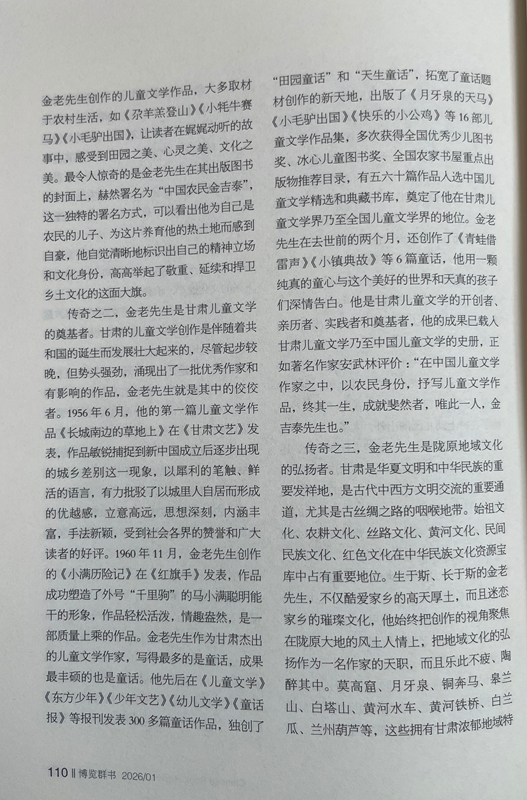 傳奇之二,金老先生是甘肅兒童文學的奠基者。甘肅的兒童文學創(chuàng)作是伴隨著共和國的誕生而發(fā)展壯大起來的,盡管起步較晚,但勢頭強勁,涌現出了一批優(yōu)秀作家和有影響的作品,金老先生就是其中的佼佼者。1956年6月,他的第一篇兒童文學作品《長城南邊的草地上》在《甘肅文藝》發(fā)表,作品敏銳捕捉到新中國成立后逐步出現的城鄉(xiāng)差別這一現象,以犀利的筆觸、鮮活的語言,有力批駁了以城里人自居而形成的優(yōu)越感,立意高遠,思想深刻,內涵豐富,手法新穎,受到社會各界的贊譽和廣大讀者的好評。1960年11月,金老先生創(chuàng)作的《小滿歷險記》在《紅旗手》發(fā)表,作品成功塑造了外號“千里駒”的馬小滿聰明能干的形象,作品輕松活潑,情趣盎然,是一部質量上乘的作品。金老先生作為甘肅杰出的兒童文學作家,寫得最多的是童話,成果最豐碩的也是童話。他先后在《兒童文學》《東方少年》《少年文藝》《幼兒文學》《童話報》等報刊發(fā)表300多篇童話作品,獨創(chuàng)了“田園童話”和“天生童話”,拓寬了童話題材創(chuàng)作的新天地,出版了《月牙泉的天馬》《小毛驢出國》《快樂的小公雞》等16部兒童文學作品集,多次獲得全國優(yōu)秀少兒圖書獎、冰心兒童圖書獎、全國農家書屋重點出版物推薦目錄,有五六十篇作品入選中國兒童文學精選和典藏書庫,奠定了他在甘肅兒童文學界乃至全國兒童文學界的地位。金老先生在去世前的兩個月,還創(chuàng)作了《青蛙借雷聲》《小鎮(zhèn)典故》等6篇童話,他用一顆純真的童心與這個美好的世界和天真的孩子們深情告白。他是甘肅兒童文學的開創(chuàng)者、親歷者、實踐者和奠基者,他的成果已載入甘肅兒童文學乃至中國兒童文學的史冊,正如著名作家安武林評價:“在中國兒童文學作家之中,以農民身份,抒寫兒童文學作品,終其一生,成就斐然者,唯此一人,金吉泰先生也。”