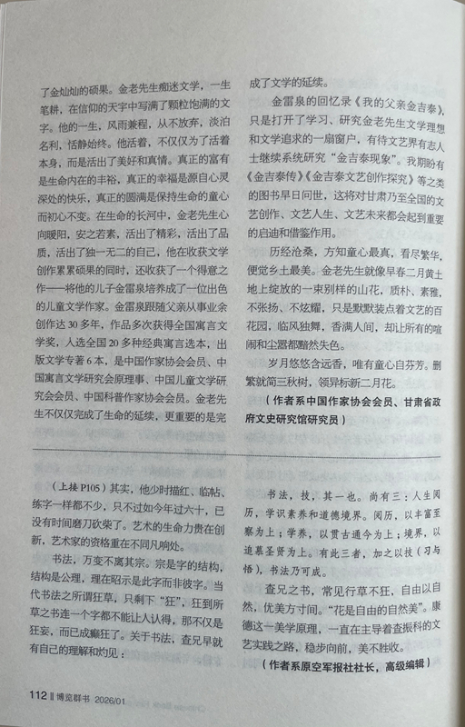 金雷泉的回憶錄《我的父親金吉泰》,只是打開了學習、研究金老先生文學理想和文學追求的一扇窗戶,有待文藝界有志人士繼續(xù)系統(tǒng)研究“金吉泰現象”。我期盼有《金吉泰傳》《金吉泰文藝創(chuàng)作探究》等之類的圖書早日問世,這將對甘肅乃至全國的文藝創(chuàng)作、文藝人生、文藝未來都會起到重要的啟迪和借鑒作用。