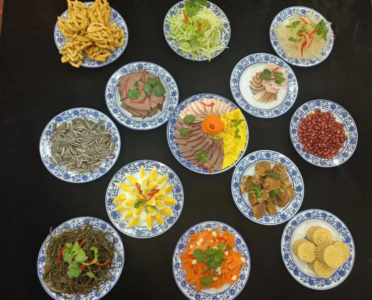 ——“十三花”,寓意胡太后以民為本的執(zhí)政理念;城內(nèi)四個葷菜,寓意人民四季安康、幸福美滿;骨頭碟和懸肉碟,寓意父骨母血、尊老孝親;肝子碟和雞蛋碟,寓意肝膽相照、心心相??;四個水菜碟子水圍城,寓意順風(fēng)順?biāo)?、四方平安;城外瓜籽花生碟,寓意多子多福、多祿多壽;路食和果子,寓意衣豐食足、一路平安;最中間一個大碟全盤為中心,寓意團(tuán)結(jié)聚力、天下一心。