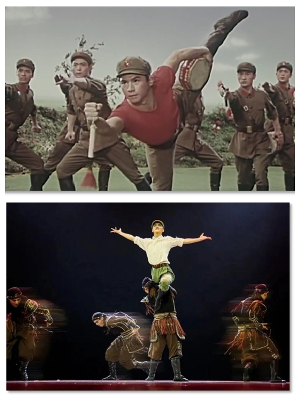 此外,配樂與道具也為作品增添了更多細節(jié),使作品更加貼近生活,富有表現(xiàn)力。作品打破配樂從屬地位的作品創(chuàng)作模式,以聲樂結(jié)構(gòu)化推進作品節(jié)奏和情感變化:開端音樂急促緊張,契合人馬對抗的故事情節(jié);隨后連長亮相指導小戰(zhàn)士,音樂也隨之沉穩(wěn)變緩;而在小戰(zhàn)士成功馴服戰(zhàn)馬后,舞蹈由獨舞過渡到男子群舞,配合鑼鼓齊鳴、節(jié)奏密集的歡快旋律,渲染馴馬成功的歡慶畫面。道具也融入作品中,配合配樂、舞蹈,形成三位一體的功能設(shè)計。張雍指出:“作為道具的鑼鼓具有三層作用——既作為戰(zhàn)士用來馴馬的道具,也作為舞者用來表演的道具。與此同時,鑼鼓自身發(fā)出的聲音作為一種韻律配合著舞蹈的節(jié)奏,也作為一種力量增強著舞蹈的力量。”配樂和道具都超越了在舞蹈作品中的從屬地位,以更具功能性的方式參與到作品創(chuàng)作中,最大限度地發(fā)揮了非語言符號的表達魅力,塑造了極具生活感的官兵日常,作品得以長盛不衰。