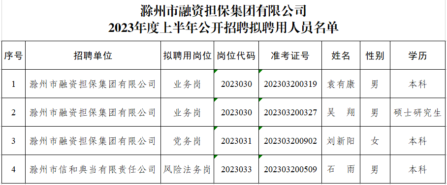 市擔(dān)保集團2023年度上半年公開招聘擬聘用人員公示