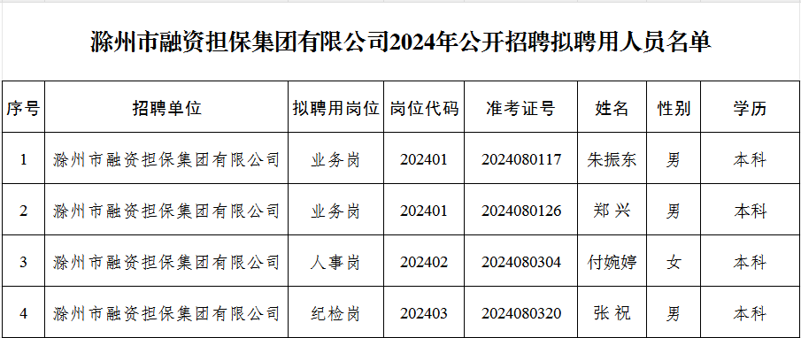 滁州市融資擔(dān)保集團有限公司2024年公開招聘擬聘用人員公示