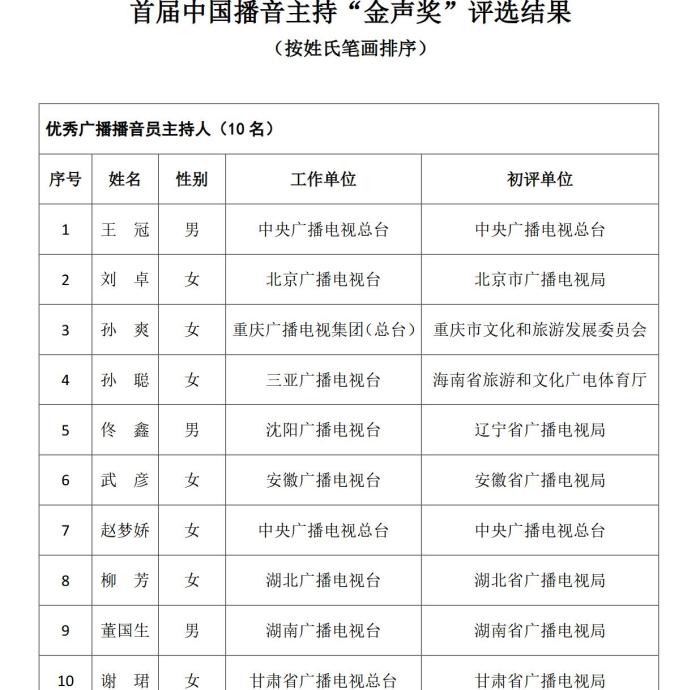 《通知》指出,根據(jù)《國(guó)家廣播電視總局辦公廳關(guān)于組織參加中國(guó)廣播電視節(jié)目獎(jiǎng)•首屆中國(guó)播音主持“金聲獎(jiǎng)”評(píng)選工作的通知》(廣電辦發(fā)〔2021〕277號(hào)),經(jīng)過(guò)初評(píng)、復(fù)評(píng)和終評(píng),評(píng)選出優(yōu)秀廣播播音員主持人、優(yōu)秀電視播音員主持人各10名?,F(xiàn)將評(píng)選結(jié)果予以公示,公示期為5個(gè)工作日。