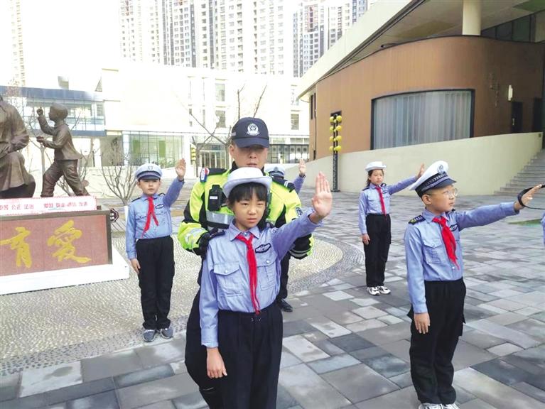 活動(dòng)中,交警針對學(xué)生年齡特點(diǎn)和認(rèn)知特征,一邊一招一式地演示,一邊講解每一個(gè)指揮手勢的要領(lǐng)和含義,讓同學(xué)們在邊學(xué)邊練的感性實(shí)踐中,加深對交通安全常識(shí)的理解與記憶。