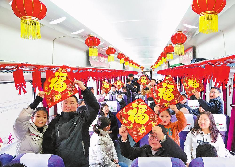 7504次“富民號”列車上張燈結彩,歡聲笑語。新春佳節(jié)來臨之際,無數人心懷著對家鄉(xiāng)的眷戀,踏上溫馨的回家之路。 新甘肅·甘肅日報記者丁凱攝