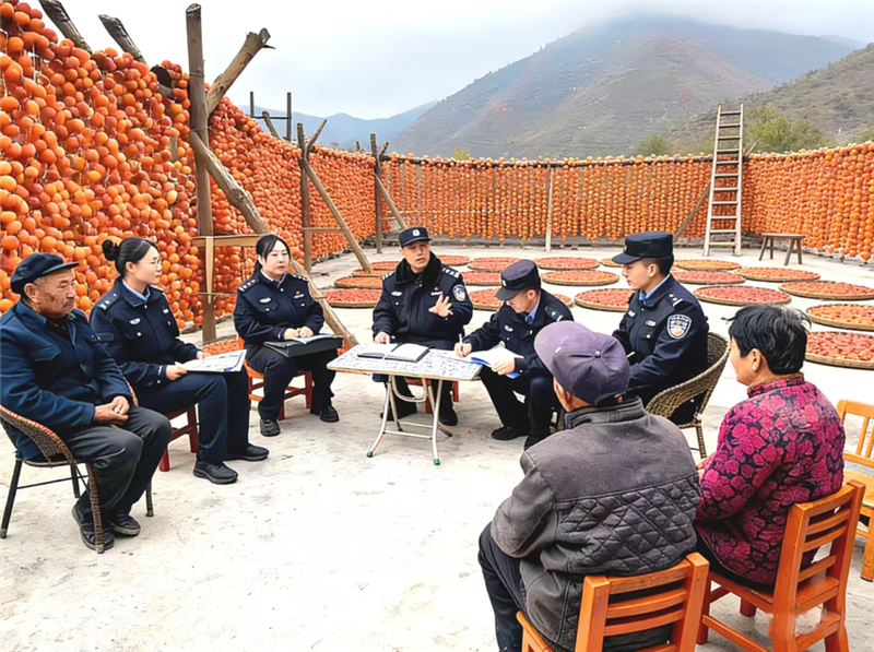 ▲舟曲縣公安局城關(guān)派出所民輔警深入轄區(qū)柿子晾曬場和柿子收購點(diǎn),開展反詐宣傳活動。(朱彤 攝)