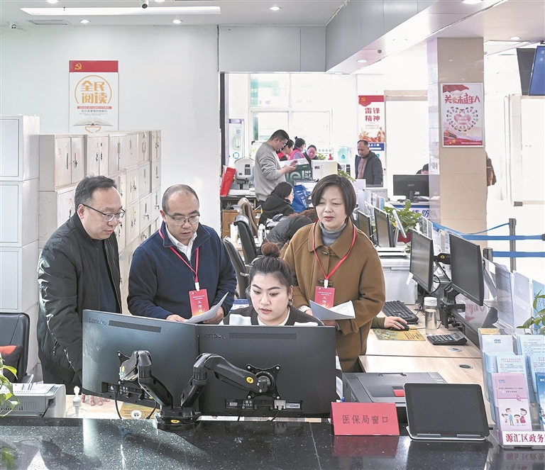 河南省漯河市源匯區(qū)紀(jì)委監(jiān)委聚焦醫(yī)保基金安全運(yùn)行等關(guān)鍵環(huán)節(jié)開(kāi)展專項(xiàng)整治,督促主管部門著力整治醫(yī)?;鸸芾碇刑搱?bào)冒領(lǐng)、騙取套取等違紀(jì)違法行為,嚴(yán)肅查處監(jiān)管失職失責(zé)及背后的不正之風(fēng)和腐敗問(wèn)題。圖為近日,該區(qū)紀(jì)委監(jiān)委工作人員到區(qū)行政服務(wù)中心醫(yī)保局窗口走訪核實(shí)相關(guān)情況。尤亞輝 攝