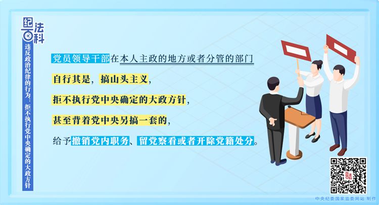 《中國(guó)共產(chǎn)黨紀(jì)律處分條例》第五十六條第一款規(guī)定,黨員領(lǐng)導(dǎo)干部在本人主政的地方或者分管的部門自行其是,搞山頭主義,拒不執(zhí)行黨中央確定的大政方針,甚至背著黨中央另搞一套的,給予撤銷黨內(nèi)職務(wù)、留黨察看或者開(kāi)除黨籍處分。