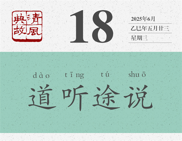 道,道路也;涂,通“途”,亦道路也。從道路上聽來,又在道路上傳播,說明既沒有經(jīng)過考證,也沒有動過腦子。從路人那里聽來的東西,不查證、不思考,又說給了另外的路人,然后一而再、再而三,結(jié)果就會“三人成虎”。如果再繼續(xù)下去,百而千,千而萬,后果就是“一人傳虛,萬人傳實(shí)”。此《四書辨疑》所謂“聽人所傳,傳己所聽,皆不可不謹(jǐn)也”。