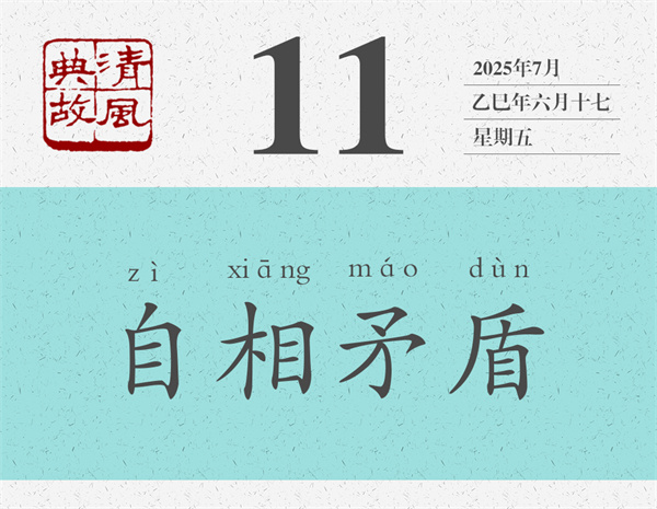 “自相矛盾”的本義是,不管是自己的矛刺穿了自己的盾,還是自己的盾無法被自己的矛刺穿,都會(huì)陷入不能自圓其說的難堪境地。后人則以“自相矛盾”為典,比喻一個(gè)人前面說的和后面說的、前面做的和后面做的相互抵觸,或者自己所說與所做、自己所為與所述互相沖突。也指同一機(jī)關(guān)、同一機(jī)構(gòu)中各個(gè)部門、各個(gè)成員之間說法不統(tǒng)一,行為不一致。宋人王觀國《學(xué)林·言行》:“圣賢言行,要當(dāng)顧踐,毋使自相矛盾。”