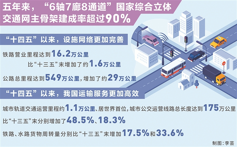 “人員貨物的高效流動彰顯了中國繁榮發(fā)展的活力。在過去一年中,平均每天約有1.8億人次跨區(qū)域出行、每天運送1.6億噸貨物、每天攬收4.78億件快遞。”劉偉說,“十四五”以來,我國運輸服務更加高效,軌道交通、常規(guī)公交、慢行交通網(wǎng)絡融合發(fā)展,城市軌道交通運營里程約1.1萬公里、居世界首位,城市公交運營線路總長度達到175萬公里,比“十三五”末分別增加了48.5%、18.3%。鐵路、水路貨物周轉(zhuǎn)量分別比“十三五”末增加17.5%和33.6%,港口集裝箱鐵水聯(lián)運量年均增速約15%。去年,全社會物流成本節(jié)約超過4000億元,其中交通運輸成本降低了約2800億元。