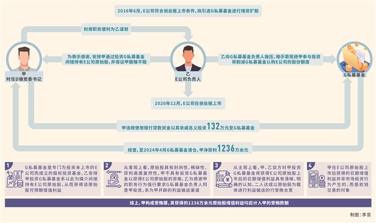 其中,2016年6月,E公司符合創(chuàng)業(yè)板上市條件,擬引進(jìn)G私募基金和H私募基金進(jìn)行增資擴(kuò)股。乙為感謝甲在企業(yè)用地審批等方面提供的幫助,提議安排甲通過投資G私募基金(該基金是專門為投資未上市的E公司而成立的股權(quán)投資基金,按照每股5.5元的價(jià)格取得E公司股本600萬股,并辦理相應(yīng)的變更登記手續(xù))間接持有E公司原始股,并告知甲E公司擬上市情況以及其會(huì)與G私募基金簽訂對(duì)賭協(xié)議(若E公司未實(shí)現(xiàn)上市,G私募基金有權(quán)要求乙原價(jià)回購,并按照年利率10%支付補(bǔ)償款),甲無需承擔(dān)市場風(fēng)險(xiǎn),穩(wěn)賺不賠,甲表示同意。此后,乙向G私募基金負(fù)責(zé)人施壓,暗示若拒絕甲參與投資將削減G私募基金認(rèn)購E公司的股份額度,并將該額度交由其競爭對(duì)手H私募基金認(rèn)購。隨后,甲違規(guī)使用銀行貸款資金以其親戚名義投資132萬元至G私募基金(根據(jù)相關(guān)規(guī)定,私募基金投資者應(yīng)當(dāng)具備相應(yīng)資金實(shí)力,不得用貸款資金從事股本權(quán)益性投資,甲的行為不符合規(guī)定)。2019年6月,I私募基金以每股11.52元溢價(jià)收購G私募基金持有的部分E公司股份。2020年12月,E公司在創(chuàng)業(yè)板上市。經(jīng)查,至2024年4月G私募基金清倉,甲凈獲利1236萬余元。