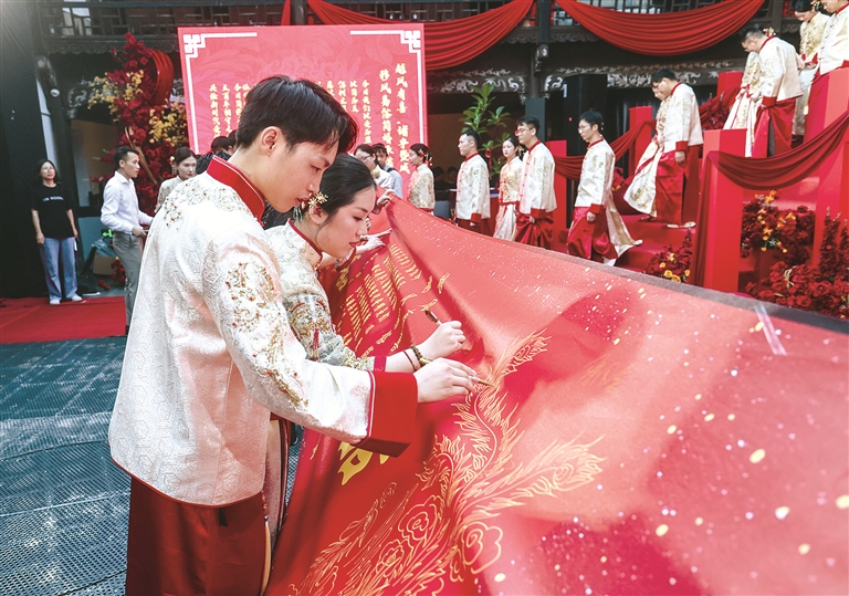 風(fēng)成于上、俗化于下。近年來,越來越多新人選擇集體婚禮,倡導(dǎo)文明簡約的婚嫁理念,通過精心設(shè)計(jì)的集體婚禮儀式,打造既莊重又溫馨的婚禮體驗(yàn),既減輕經(jīng)濟(jì)負(fù)擔(dān)、又傳承美好家風(fēng),倡導(dǎo)婚俗改革文明新風(fēng)尚。圖為在浙江省諸暨市西施故里景區(qū)內(nèi),參加集體婚禮儀式的新人們簽訂移風(fēng)易俗簡婚承諾。新華社記者 徐昱 攝