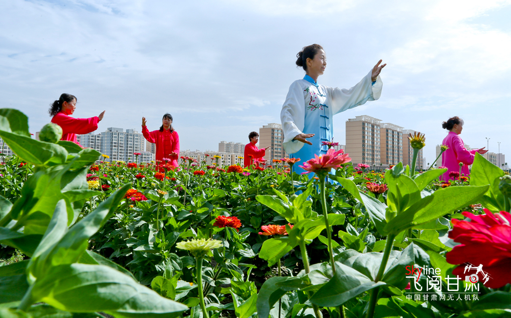 7月8日清晨,甘肅張掖甘州區(qū)順祥名苑小區(qū)南側(cè)的123畝裸露土地綠化美化點(diǎn)上,各種鮮花競相綻放,花香四溢,綠意盎然,太極拳練習(xí)愛好者正在練習(xí)太極拳。