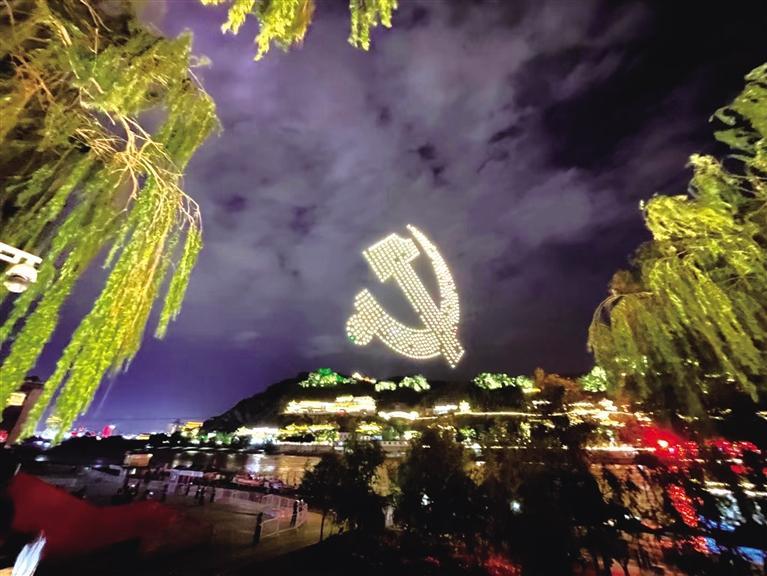 今夜的蘭州經(jīng)過雨水的沖洗格外清爽嫵媚,在現(xiàn)場,600架無人機(jī)翱翔天空,照亮璀璨的蘭州之夜,無人機(jī)在遙控下變換著各種隊(duì)形和字樣,表達(dá)對黨的生日祝福。