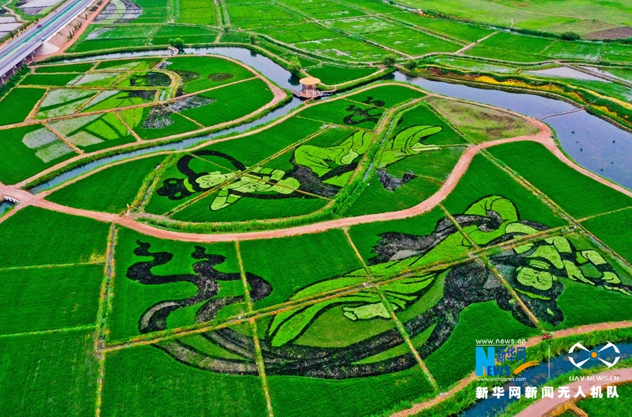 13日清晨,一場(chǎng)小雨過后,朝陽(yáng)照射在甘肅省張掖市甘州區(qū)烏江鎮(zhèn)新河田園綜合體稻田景觀區(qū)內(nèi),2000多畝稻田中一幅幅稻田畫栩栩如生,從高處俯瞰,田園風(fēng)光和生態(tài)美景展現(xiàn)在人們眼前。