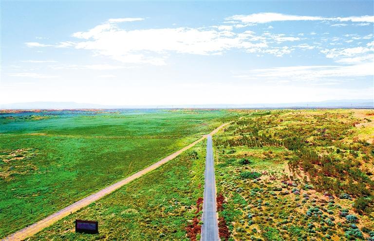 古浪縣北部沙區(qū)十二道溝附近,綠色在沙漠中延伸。新甘肅·甘肅日報記者 金奉乾