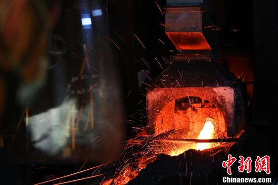 金川集團(tuán)鎳冶煉廠閃速爐車(chē)間主廠房?jī)?nèi),工作人員在閃速爐爐前燒口進(jìn)行低鎳锍排放作業(yè)。