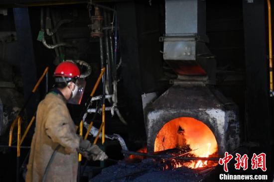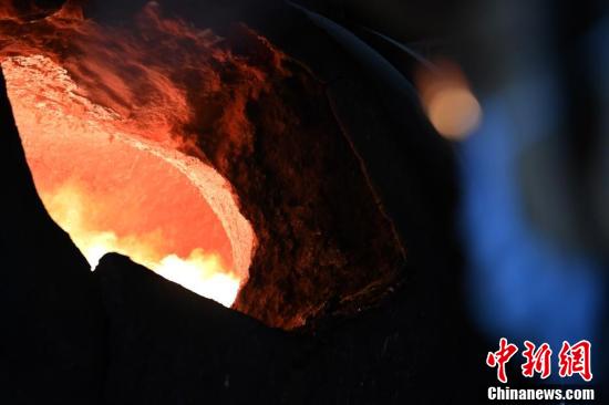 金川集團(tuán)鎳冶煉廠閃速爐車(chē)間內(nèi),工作人員穿戴專(zhuān)業(yè)防護(hù)裝備觀察轉(zhuǎn)爐天然氣烤爐。