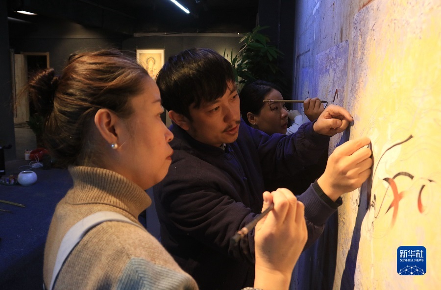 2月22日,在敦煌小鎮(zhèn)鳴沙書院,藝術工作者張杰龍(中)指導學員臨摹敦煌壁畫。
