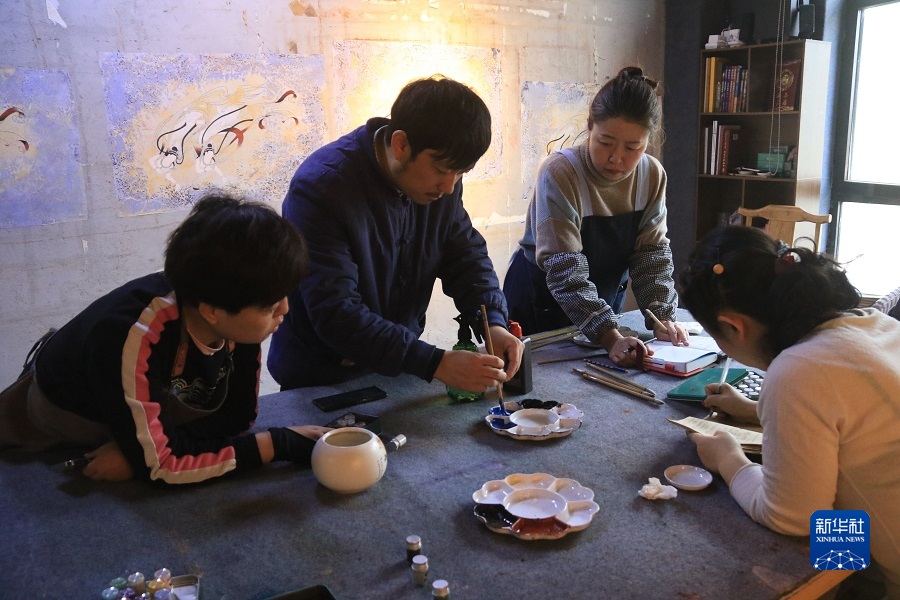2月22日,在敦煌小鎮(zhèn)鳴沙書院,藝術工作者張杰龍(中)指導學員進行顏料調色。