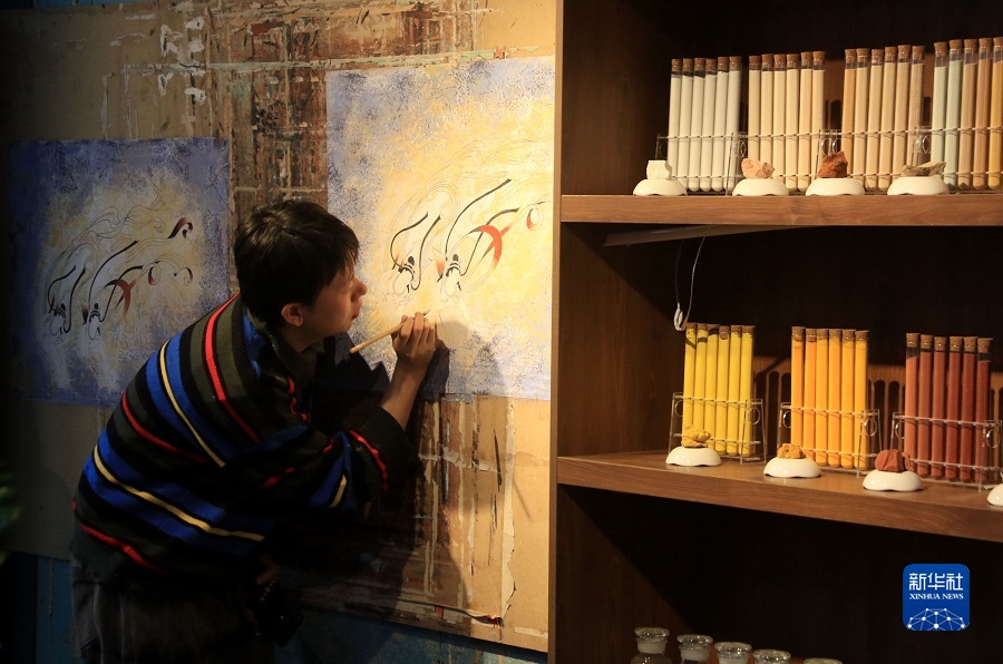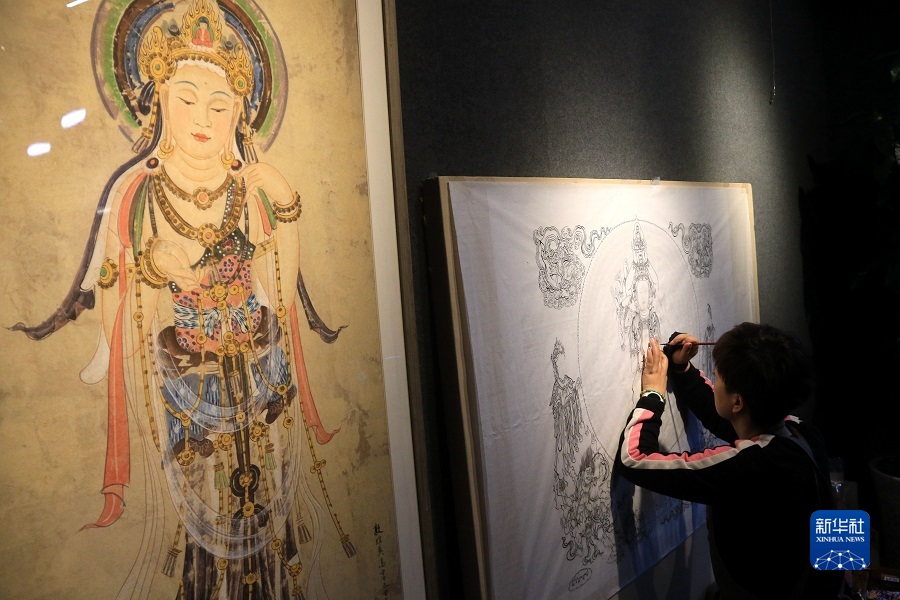 2月22日,在敦煌小鎮(zhèn)鳴沙書院,來自陜西的學員吳恩梵學習敦煌壁畫臨摹技藝。