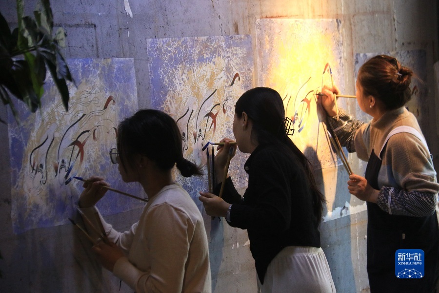 2月22日,在敦煌小鎮(zhèn)鳴沙書院,學員學習敦煌壁畫臨摹技藝。