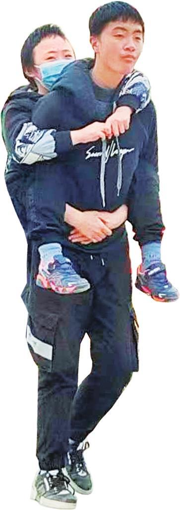 王浩背著王超上學(xué)放學(xué)。