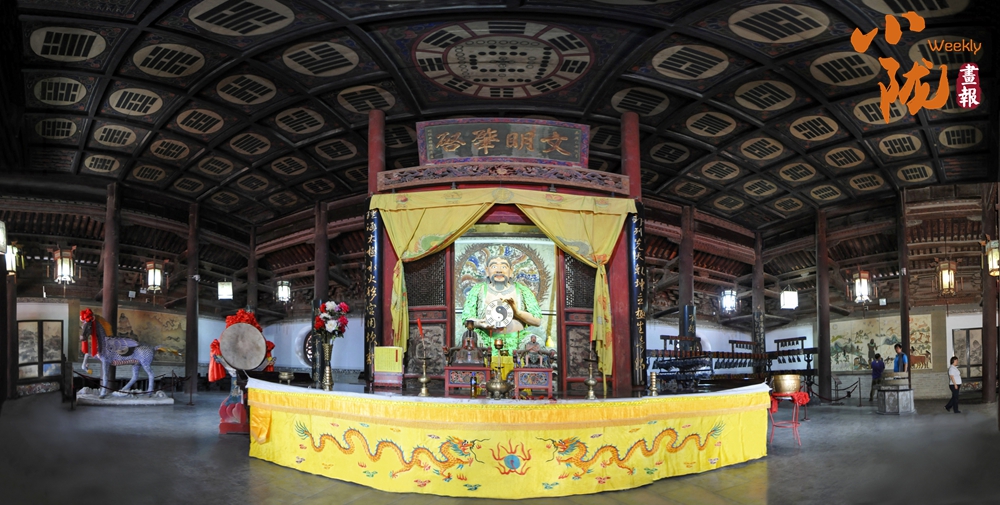 先天殿莊嚴(yán)肅穆,殿內(nèi)正中便是高達(dá)3米的人文始祖伏羲坐身塑像,樹(shù)葉披身,手持八卦盤(pán),氣宇軒昂,雙目炯炯凝視前方,神龕上方懸掛著清嘉慶時(shí)州牧王賜均書(shū)“文明肇啟”巨匾,仰頭上望,頂上繪有河圖洛書(shū)、六十四卦,令人肅然起敬。