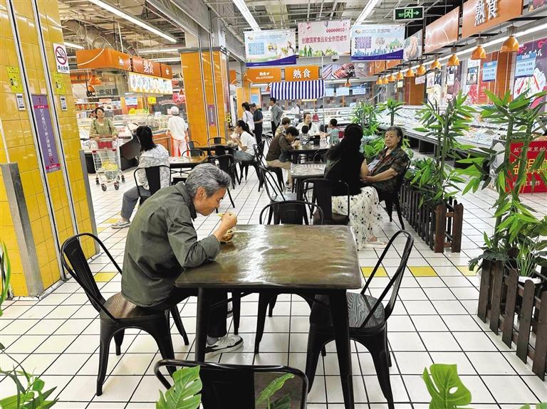 超市里的“平價(jià)食堂”,成為打造一刻鐘便民生活圈的重要載體。“超市周邊的居民、上班族、學(xué)生、酒店差旅客群的基礎(chǔ)比較大,所以增加快餐、堂食也是超市的一項(xiàng)便民舉措。”超市里升騰起的煙火氣,也讓超市的來客率明顯提升,“周末時(shí),油條的銷量能達(dá)到1000根、豆腐腦能賣到500碗,不管是檔口、自助收銀機(jī)都有排隊(duì)的顧客。”