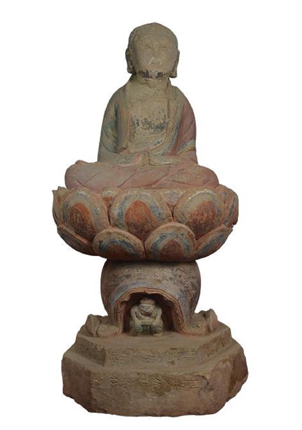 北魏蓮瓣形造像碑,出土于合水縣城關(guān)東關(guān)村,碑長(zhǎng)36CM,寬24CM,高21CM。蓮瓣形,龕楣上雕七佛造像,龕內(nèi)交腳佛端坐正中,佛像戴蓮花冠,披袈裟,兩側(cè)侍立脅侍菩薩,雙手合十,龕門(mén)臥二獅,不大,但雕刻工藝精美絕倫,呈現(xiàn)的意境更是妙趣橫生。