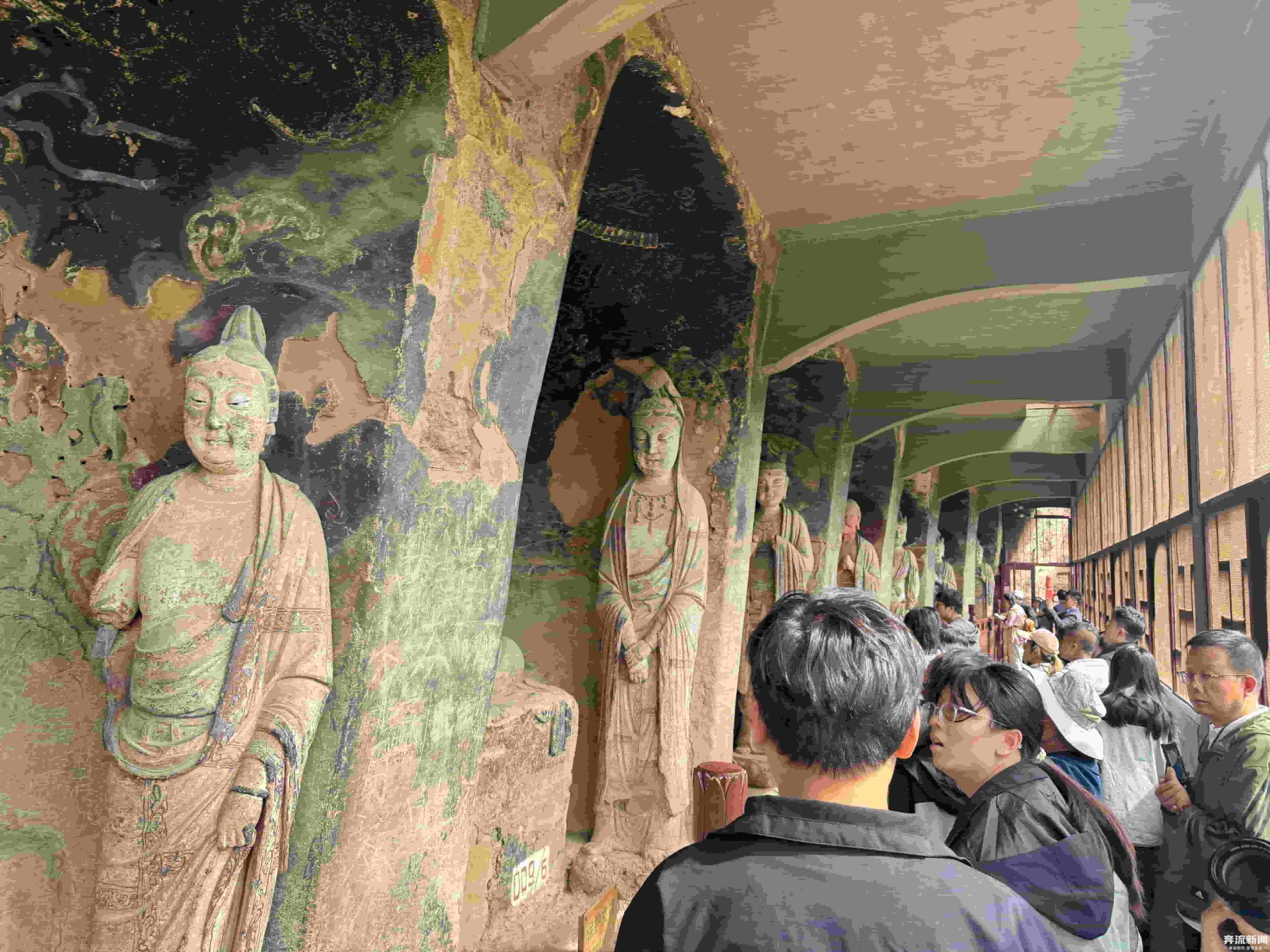 窟內(nèi)佛像造型各異,色彩鮮艷,既有莊嚴(yán)肅穆的佛祖、菩薩,也有生動活潑的弟子、天王。這些造像中,雖然有石雕和個別的木雕,但主要以泥塑為主,體現(xiàn)了多朝代中國佛教泥塑造像藝術(shù)的發(fā)展演變規(guī)律。奔流新聞記者了解到,在技法上,工匠們運(yùn)用了圓雕、浮雕、鏤雕等多種技藝,使得佛像栩栩如生,富有強(qiáng)烈的立體感和動感。麥積山石窟也因為其獨(dú)特的“東方微笑”與精美的泥塑藝術(shù)聞名于世,被譽(yù)為“東方雕塑陳列館”。