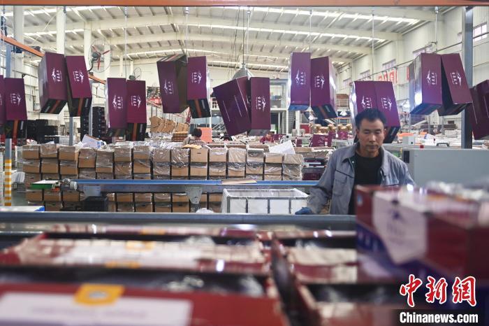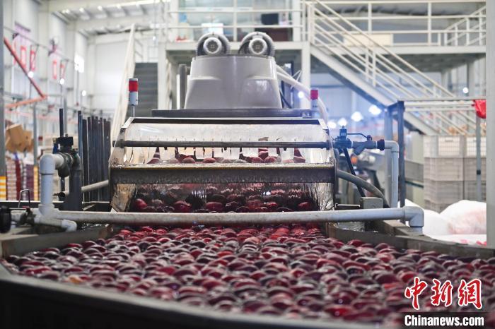 10月21日,在甘肅省天水市秦安縣雪原果品有限公司加工車間,蘋果自動化分揀線上工作人員進行分揀工作。該生產(chǎn)線每天能處理30噸蘋果,蘋果經(jīng)過設(shè)備水洗、烘干、稱重等環(huán)節(jié),進入不同等次的包裝線,工人們再對每顆蘋果進行復(fù)檢、貼標,分裝在不同規(guī)格的包裝箱中。甘肅秦安蘋果總面積61.37萬畝,產(chǎn)量86.8萬噸,產(chǎn)值55.6億元人民幣,先后從國內(nèi)科研院所引進青砧、M26、ZH5等抗重茬蘋果矮化砧木6個,配合國家蘋果產(chǎn)業(yè)技術(shù)體系,引進長富2號、煙富6號、煙富8號、瑞香紅等蘋果新品種12個。中新社記者李亞龍攝