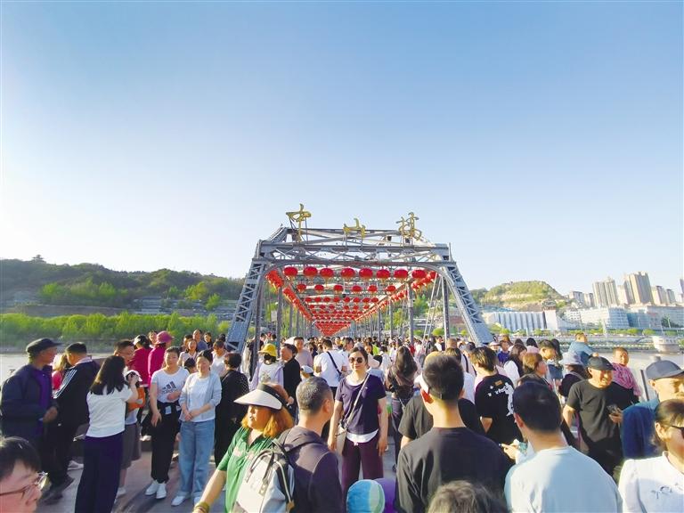 蘭州以火樣熱情和西北風情吸引天南海北游客紛至沓來,人們在煙火氣和文化味之間尋找到這座城市的獨特魅力。圖為中山橋前游人如織。