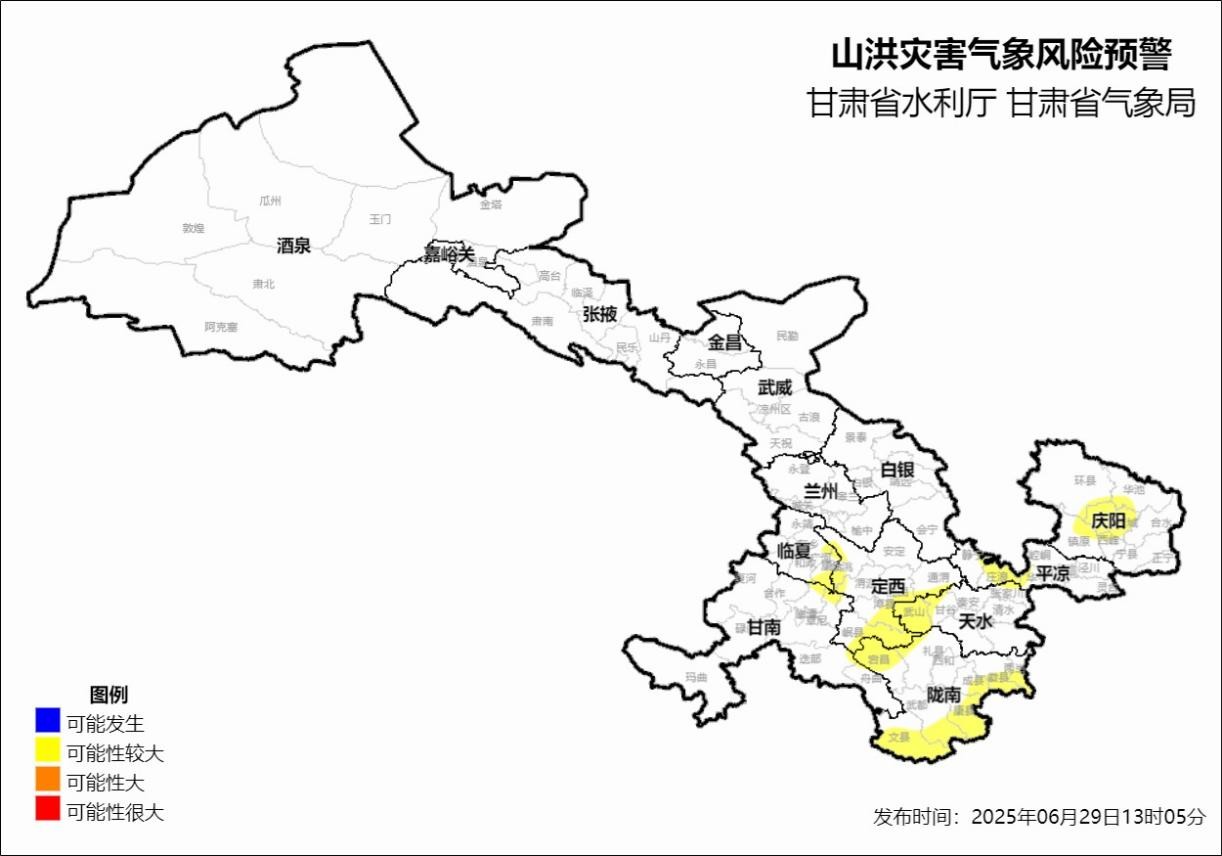 根據(jù)省氣象局《重大氣象信息專報》(2025年甘氣第10期),未來十天甘肅省多降水天氣,具有對流性強、小時雨強大、累積雨量大等特點,洪水災(zāi)害風險高。6月29日13時,省水利廳、省氣象局聯(lián)合發(fā)布山洪災(zāi)害氣象風險預(yù)警:預(yù)計,6月29日14時至30日14時,白銀市(景泰縣),武威市(古浪縣),定西市(臨洮縣、渭源縣、通渭縣、隴西縣、漳縣、岷縣),臨夏州(廣河縣、東鄉(xiāng)縣、康樂縣),甘南州(臨潭縣、卓尼縣、舟曲縣、迭部縣),天水市(秦安縣、甘谷縣、武山縣、張家川縣),隴南市(宕縣、禮縣、武都區(qū)、成縣、文縣、康縣、徽縣、兩當縣),平?jīng)鍪校o寧縣、崆峒區(qū)、華亭市、莊浪縣),慶陽市(西峰區(qū)、慶城縣、環(huán)縣、華池縣、鎮(zhèn)原縣)等地區(qū)發(fā)生山洪災(zāi)害可能性較大(黃色預(yù)警)。