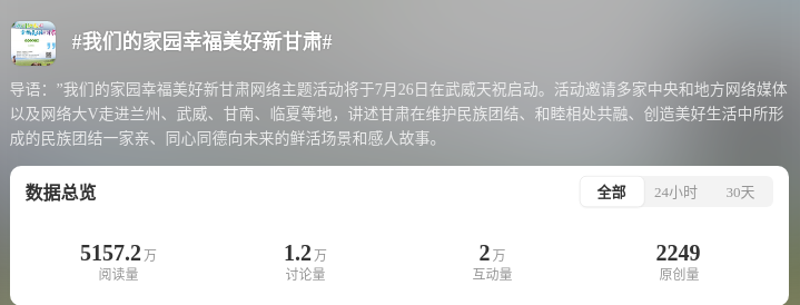 為深化互動(dòng)引導(dǎo),打造高流量IP,@甘肅網(wǎng)信、@快看甘肅等官方賬號(hào)發(fā)起社交平臺(tái)互動(dòng)話(huà)題#我們的家園幸福美好新甘肅#。結(jié)合#厚道甘肅##萬(wàn)千氣象看甘肅#等話(huà)題,@中新觀隴、@中國(guó)甘肅網(wǎng)、@甘肅好網(wǎng)民、@蘭州新區(qū)發(fā)布、@甘南融媒等賬號(hào)同步發(fā)力、同頻共振。目前,該話(huà)題總閱讀量超5530萬(wàn)人次,討論互動(dòng)量3.2萬(wàn)人次。