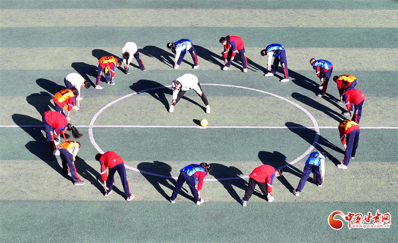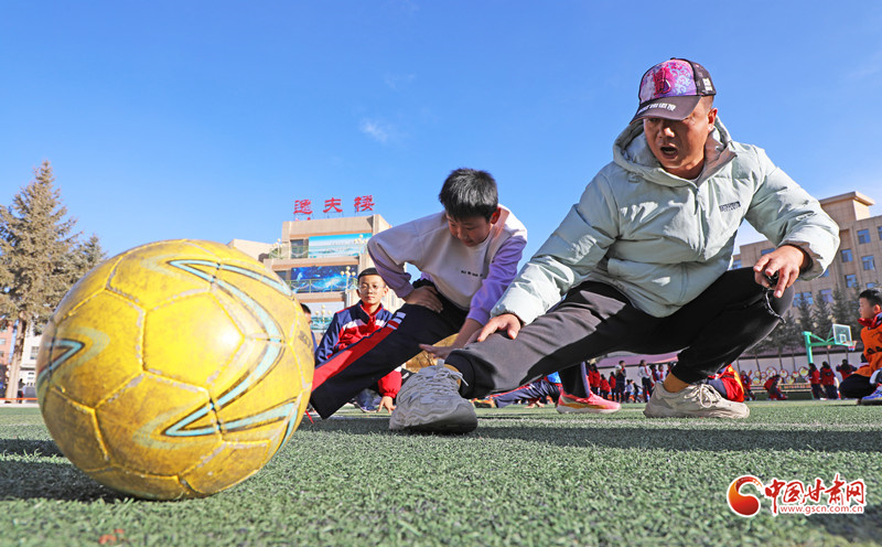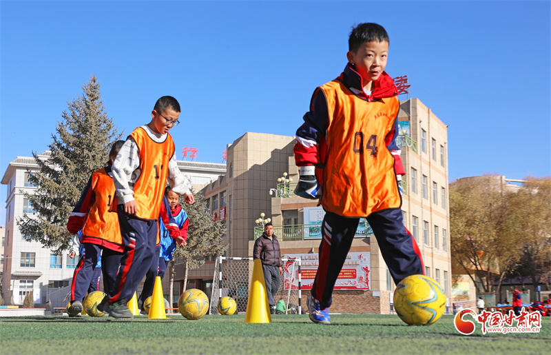 11月11日,在張掖市民樂縣洪水小學的足球場上,學生們在進行足球訓練。