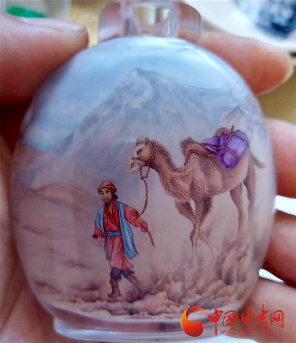 從那以后,趙英的鼻煙壺就換了模樣。瓶里不再只有小橋流水,還有大漠孤煙的蒼茫,是飛天起舞的靈動(dòng),是駝鈴叮當(dāng)?shù)挠七h(yuǎn)。他畫的飛天,飄帶里裹著敦煌特有的清朗氣韻,衣袂翻飛間仿佛能拂過戈壁的風(fēng);他畫的駝隊(duì),腳印里踩著河西古道的千年滄桑,領(lǐng)隊(duì)的胡商臉上帶著風(fēng)塵仆仆的堅(jiān)毅;就連壁畫里供養(yǎng)人的衣飾紋樣、古道上的砂石肌理,都被他精準(zhǔn)捕捉,在方寸之間定格成永恒的絲路圖景。有游客逛店時(shí)看到這些鼻煙壺,忍不住驚嘆,說捧著這小瓶子,就像捧著一整個(gè)濃縮的敦煌。
