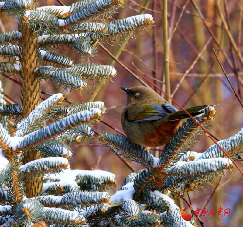 鏡頭之中,一只橙翅噪鹛靜棲于積雪覆蓋的松枝之上,宛如冰雪秘境中的靈動(dòng)精靈。它通體覆著柔和的灰褐色羽衣,橙黃色的初級(jí)飛羽在皚皚白雪的映襯下愈發(fā)鮮亮,臀部與下腹部的黃褐色絨羽則增添了幾分溫婉質(zhì)感。鳥兒側(cè)首凝望,眼眸澄澈靈動(dòng),將這一山地物種特有的警覺與優(yōu)雅姿態(tài)展現(xiàn)得淋漓盡致。