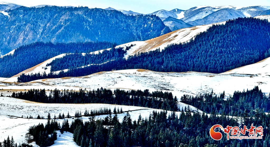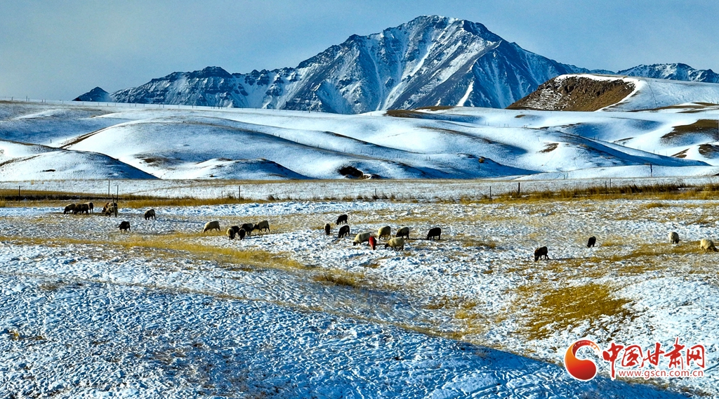 1月24日雪后初霽,肅南裕固族自治縣境內的祁連山銀裝素裹,云霧繚繞。雪山、峽谷、森林、草原在皚皚白雪中交相輝映,冬意盎然。牛群、馬群與羊羔在雪中草原上靜靜的覓食,勾勒出一幅人與自然和諧共生的壯美畫卷。