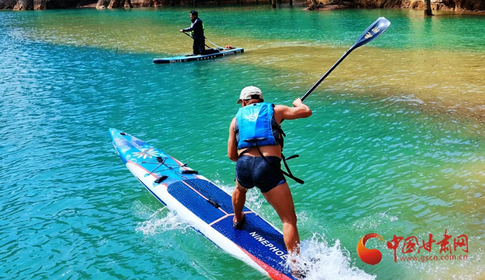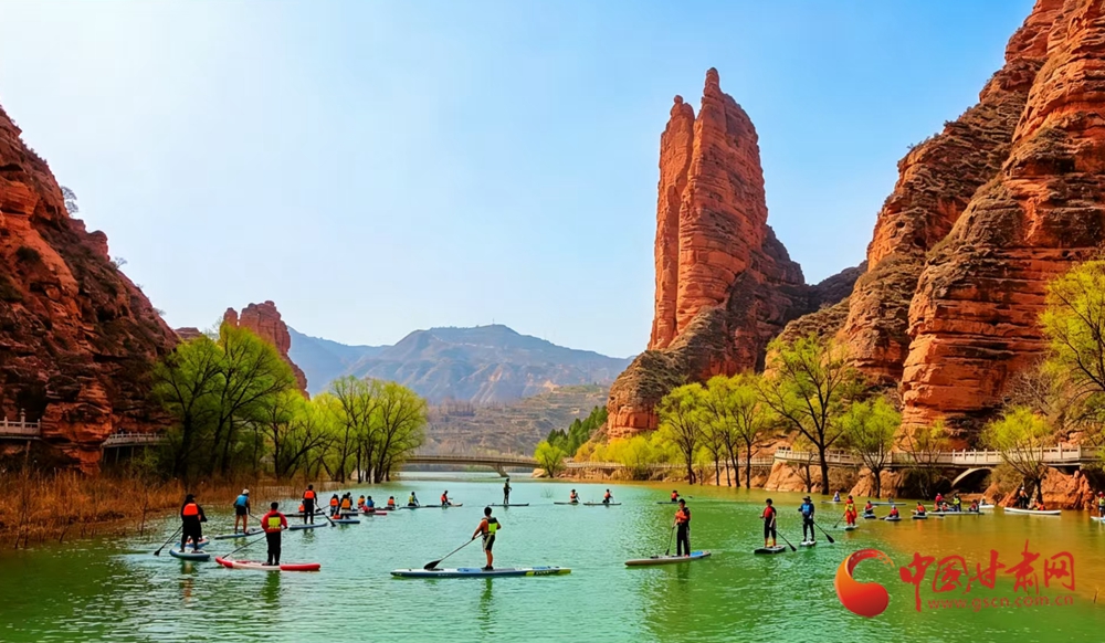 槳板愛好者們立于碧波之上,奮力揮槳,身后是炳靈寺石窟億萬年雕琢的丹霞峰林,是沉淀了1600余年的絲路文明印記。當(dāng)天,永靖縣“‘郁’見黃河·花漾永靖”郁金香文化旅游系列活動正式啟動,炳靈寺水域同步開展槳板文旅活動,成為本次春季文旅IP的核心亮點。
