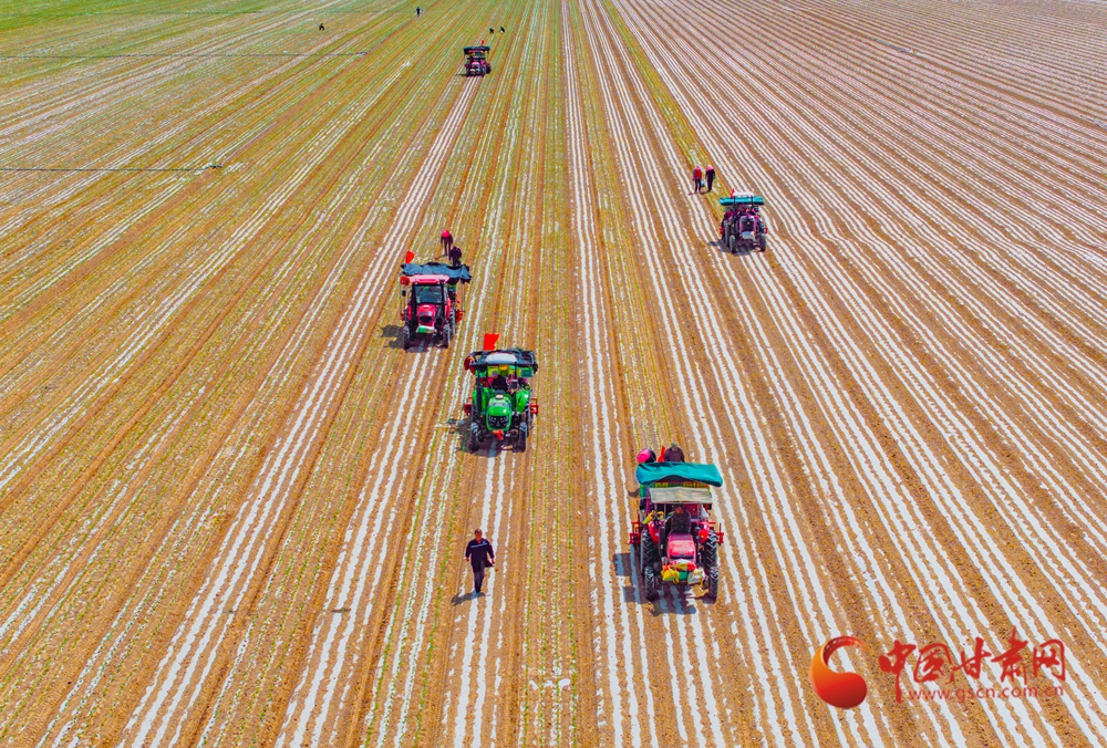 春日,走進(jìn)定西臨洮的田間地頭,一壟壟覆膜蜿蜒如銀色絲帶,在暖陽(yáng)下泛起粼粼波光。洮河水畔,杏花初綻,村民們正彎腰點(diǎn)種、培土壓膜。新翻的泥土氣息混著花香彌漫田間。農(nóng)機(jī)轟鳴處,白膜與藍(lán)天相映,勾勒出黃土高原上最動(dòng)人的春耕畫卷。