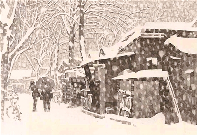 休息日,大雪天,況晗背著畫具出門作畫。濕式水彩畫,講究水色淋漓,是用排筆將清水洇濕畫紙然后作畫。一幅寫生未成,畫筆已然結(jié)冰。況晗的家鄉(xiāng)氣候濕潤(rùn),墻縫里面生的是青苔。北京的氣候干燥,墻縫里面積存的是數(shù)百年的塵土。家鄉(xiāng)村野的色調(diào)是青綠,京城胡同的色調(diào)是灰白,于是況晗改用寬線條鉛筆畫來寫意胡同。