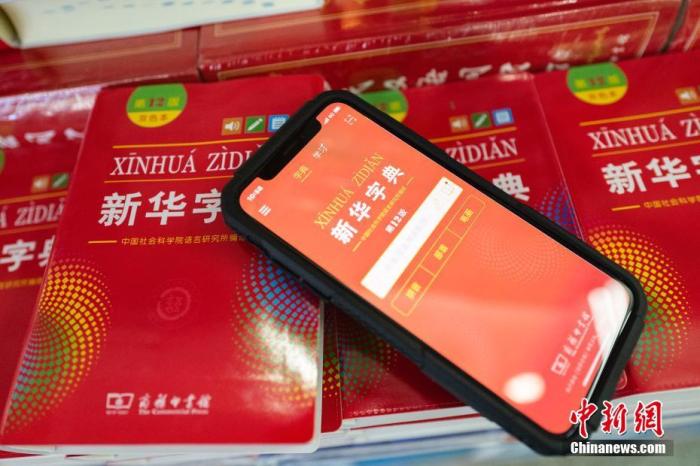 8月11日,北京圖書大廈出售的《新華字典》(第12版)及同步上線的同名手機應用程序。中新社記者 侯宇 攝