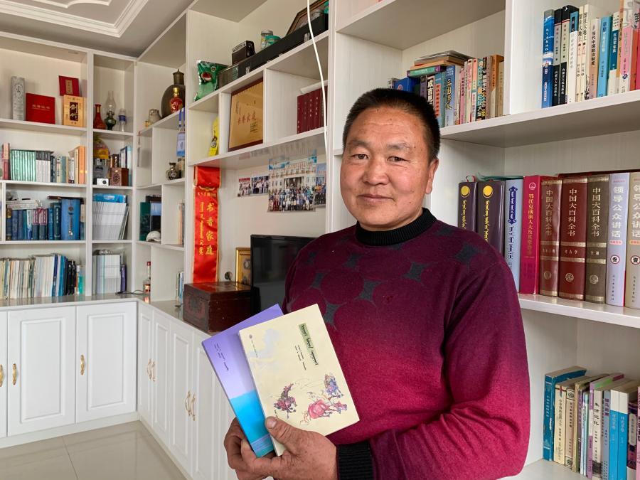 為收藏圖書,敖特根達(dá)來在家里專門建起一間書房。“這是我和其他牧民朋友創(chuàng)作的詩歌散文集。”從書架拿下兩本書的敖特根達(dá)來對記者說,閑暇之余他還會(huì)寫些詩歌散文,他的百余篇作品都已在當(dāng)?shù)匕l(fā)表,不久前他還受邀參與到附近巴彥希里嘎查地方志的撰寫中。“鎮(zhèn)里很支持我們的文學(xué)創(chuàng)作,越來越多的牧民開始喜歡閱讀和寫作。”敖特根達(dá)來說。
