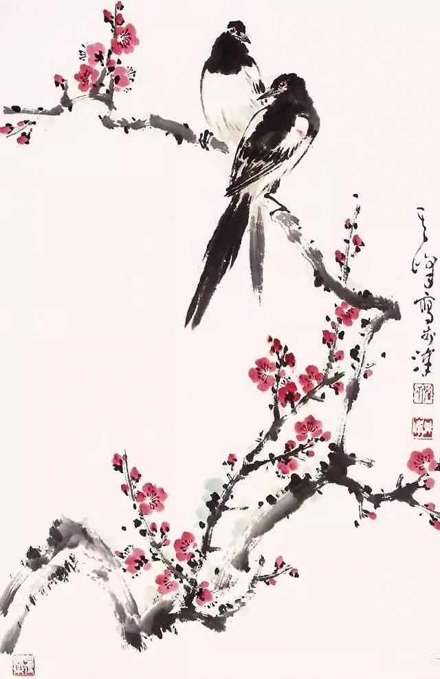 那是我第一次看見(jiàn)梅花,墨黑的枝干上,稀稀疏疏臥著幾朵紅紅的梅花,很安靜。畫上有四個(gè)字:傲雪紅梅。兩邊還有對(duì)聯(lián),內(nèi)容已經(jīng)不記得了。正值外面大雪紛飛,院子里已落了一層白白的積雪,一時(shí)間詩(shī)意悠然。對(duì)著那副梅花圖,清清爽爽的,令人內(nèi)心好快樂(lè)。那時(shí),我在讀《紅樓夢(mèng)》,只記住了那句:琉璃世界白雪紅梅。