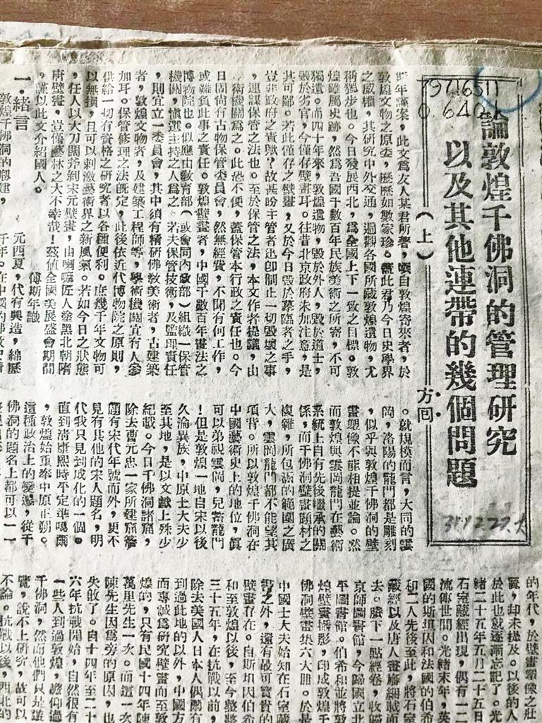 向達(dá)先生曾先后兩次考察敦煌,第一次是在1942年4月,中央研究院組織西北史地考察團(tuán),其中的歷史考古組由中央研究院歷史語言研究所、中央博物院與北京大學(xué)聯(lián)合組成,向達(dá)代表北大并擔(dān)任歷史考古組主任。在這次考察中,他在給友人、南京博物院院長曾昭燏的信件中講述了他第一次看到敦煌莫高窟時的激動心情,同時對于莫高窟受到自然和人為的毀壞而感到痛心。他用三天的時間寫成了一萬多字、此后對敦煌學(xué)有重大影響的《論敦煌千佛洞的管理研究以及其他連帶的幾個問題》,署名“方回”寄給了傅斯年,后經(jīng)傅斯年推薦,在重慶的《大公報》連載發(fā)表,文中提出將千佛洞收歸國有,由學(xué)術(shù)機(jī)構(gòu)進(jìn)行管理,開展研究工作等建議。此文發(fā)表,一石激起千層浪,直接推動國立敦煌藝術(shù)研究所于1944年成立。研究所成立后,常書鴻任所長。這也開啟了“敦煌學(xué)”長流不息的淵源。樊錦詩后來也撰文稱:“他(向達(dá))文章中提出的關(guān)于保護(hù)和管理的具體建議,被后來成立的敦煌藝術(shù)研究所采納,成為敦煌石窟保護(hù)和管理的參照。向達(dá)提出的‘不可輕易剝離壁畫’的主張,也是敦煌研究院幾十年來在壁畫保護(hù)和管理中一直恪守的紀(jì)律和原則。”